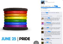 Les comparto otro ejemplo, en la misma línea. La marca Oreo, publicó la siguiente foto en su página Facebook el día 25 de junio, día mundialmente declarado como el del “orgullo Gay”: la tradicional galletita, pero con el interior de los colores de la bandera gay.