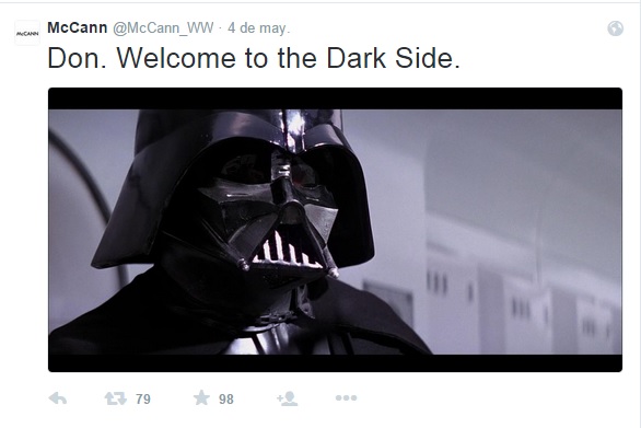 Pero la agencia lo hace con mucho humor, y los tweets que publica en su cuenta de Twitter @McCann_WW son geniales. Durante la emisión de la serie, hace comentarios en real time, sobre lo que va sucediendo, en algunos casos defendiendo a la agencia, y en otros casos directamente inculpándose, como por ejemplo cuando le da la bienvenida a Don Drapper a la nueva agencia (ver foto de arriba).